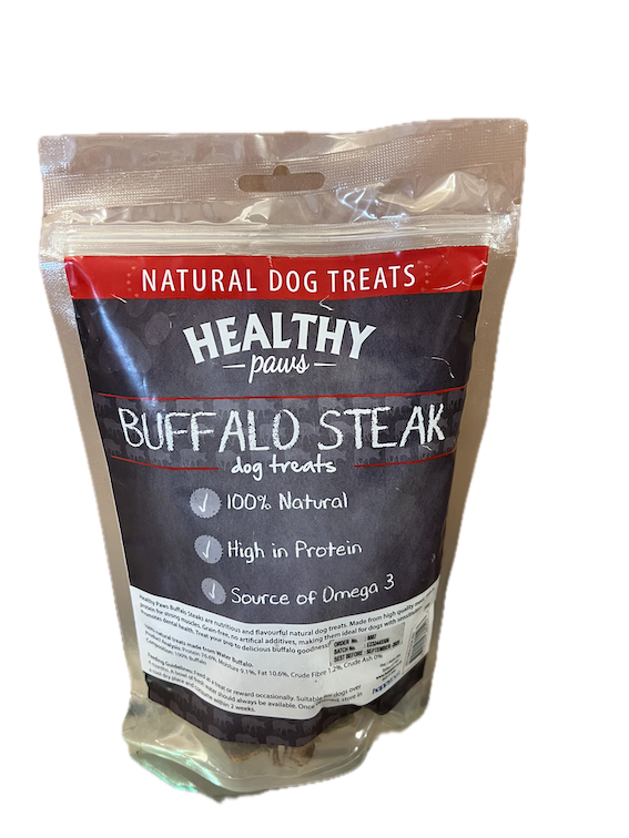 Buffalo steak is lower in fat and cholesterol compared to beef making it a healthier choice for dogs. It is dehydrated to create a chewy texture and preserve the rich taste of the meat.