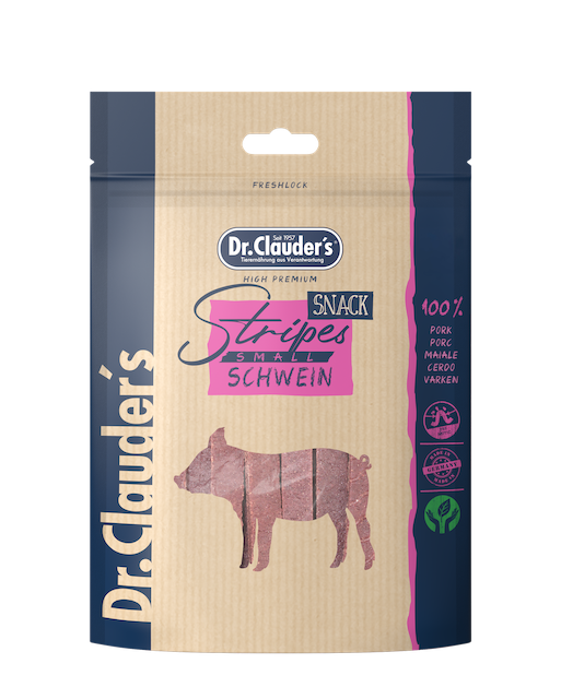 Dr.Clauder's Stripes Snacks Pork consist of 95% delicious pork. Due to the gentle steam drying process, the meat retains its unique flavour. With FOS.